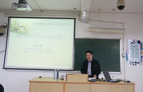 2014年12月28日上午8:30-10:30,《课程·教材·教法》编辑部副主编刘启迪老师应我校邀请,为全校师生在博文楼东区506开展主题为《课程改革的文化自觉之旅》的讲座,本次讲座由黄清教授主持。