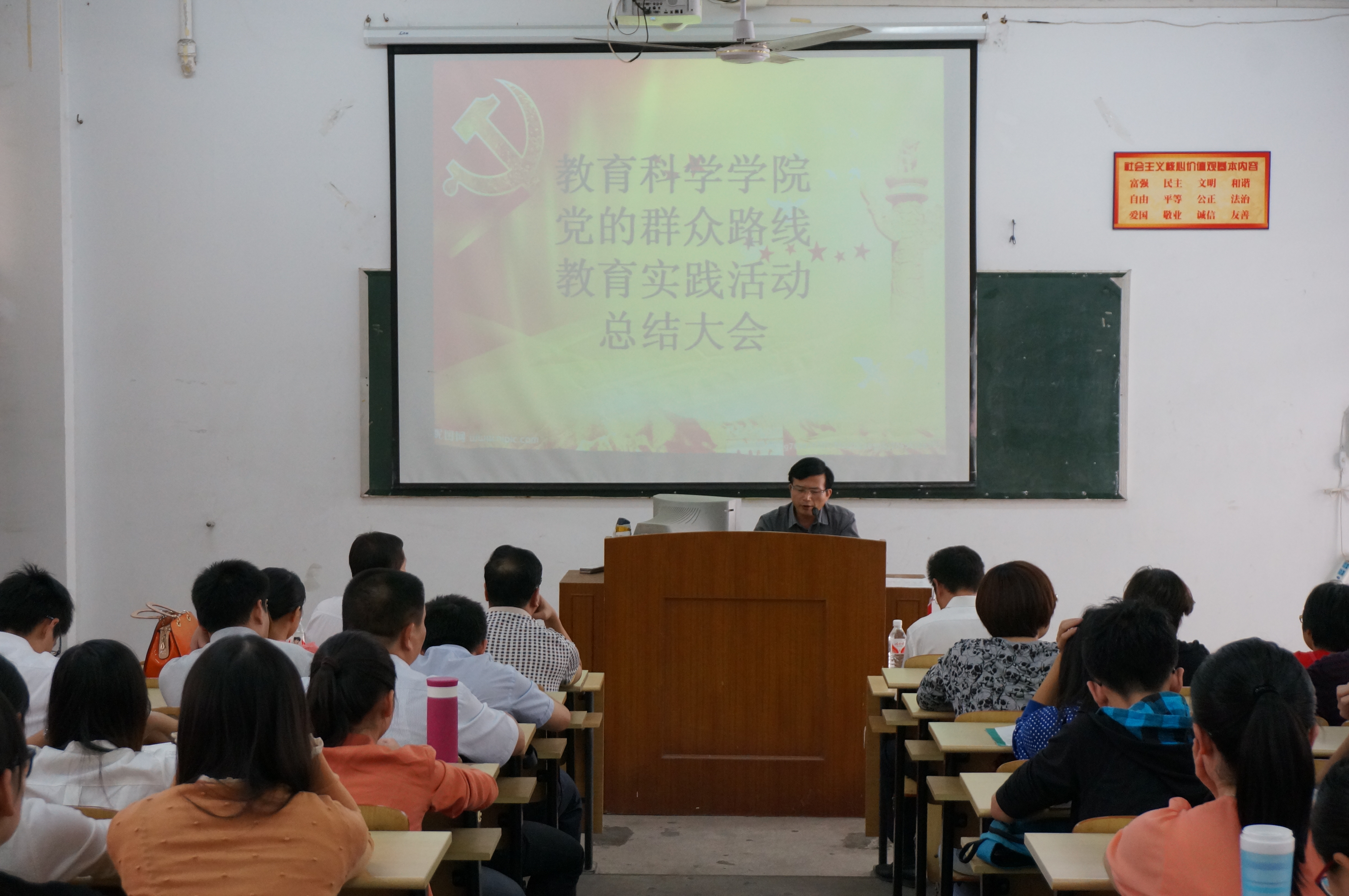2014年10月23日下午三点,教育科学学院在阶梯教室一楼召开党的群众路线教育实践活动总结大会。校党委副书记吴彬镪出席会议并发表重要讲话。校教育实践活动彭金发督导员、学院全体教师党员、学生党员参加大会。会议由教育科学学院党总支书记朱志明主持。
