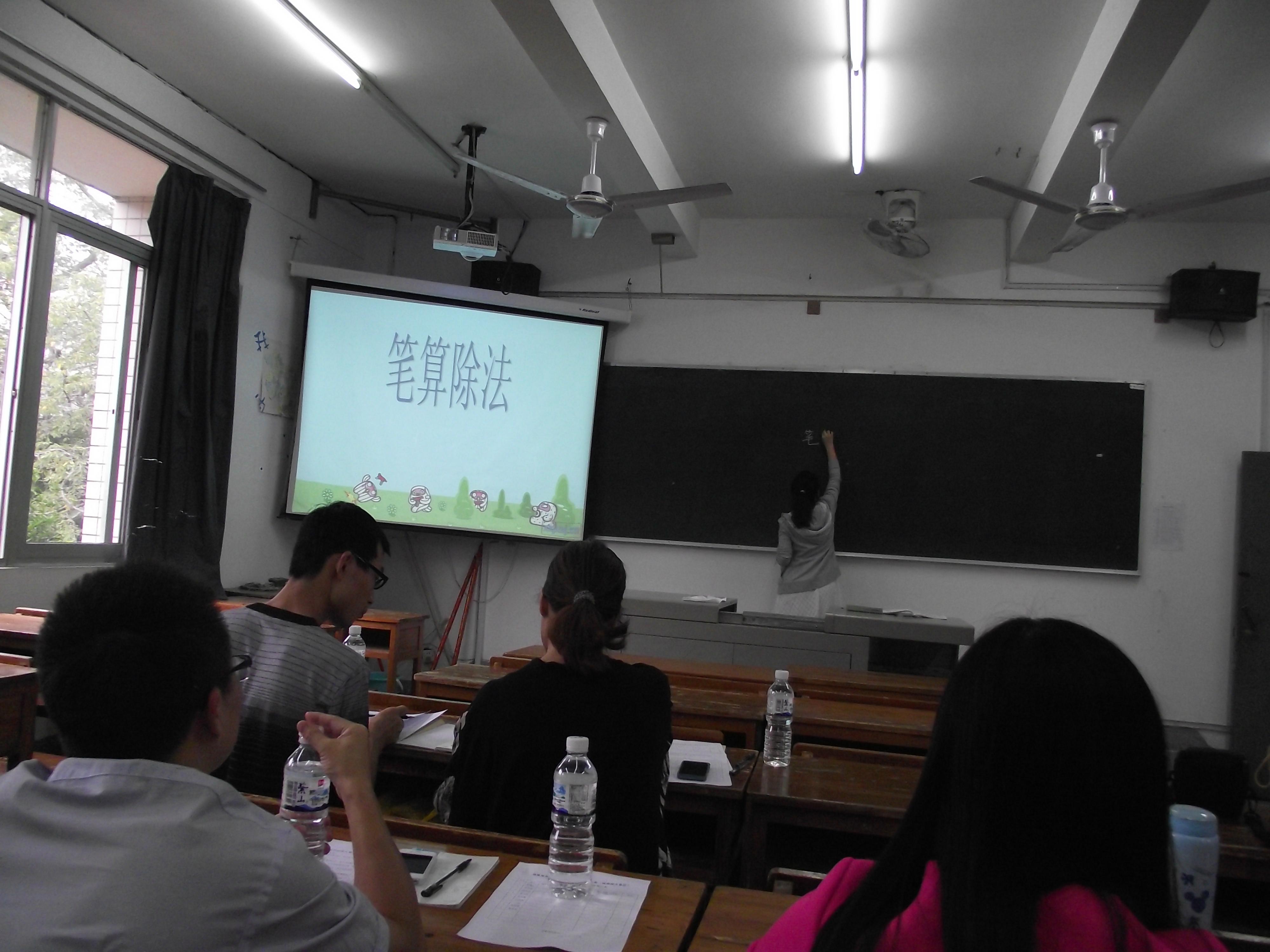 为进一步提高我省师范类毕业生的教学技能水平和就业竞争力,福建省教育厅决定于2014年12月中旬举行福建省首届高校师范生教学技能大赛。为了选拨优秀选手参赛,11月6日,教科院分管教学的院系领导、小学教育专业的全体在校教师和聘请的漳州龙师附小的赵璟校长(小学语文特级教师)、闽南师大附小的张成科老师(2013年福建省第二届中小学教师教学技能大赛小学数学组二等奖获得者)一起,在逸夫楼401教室至404教室举行2011级小学教育专业师范生教学技能大赛。