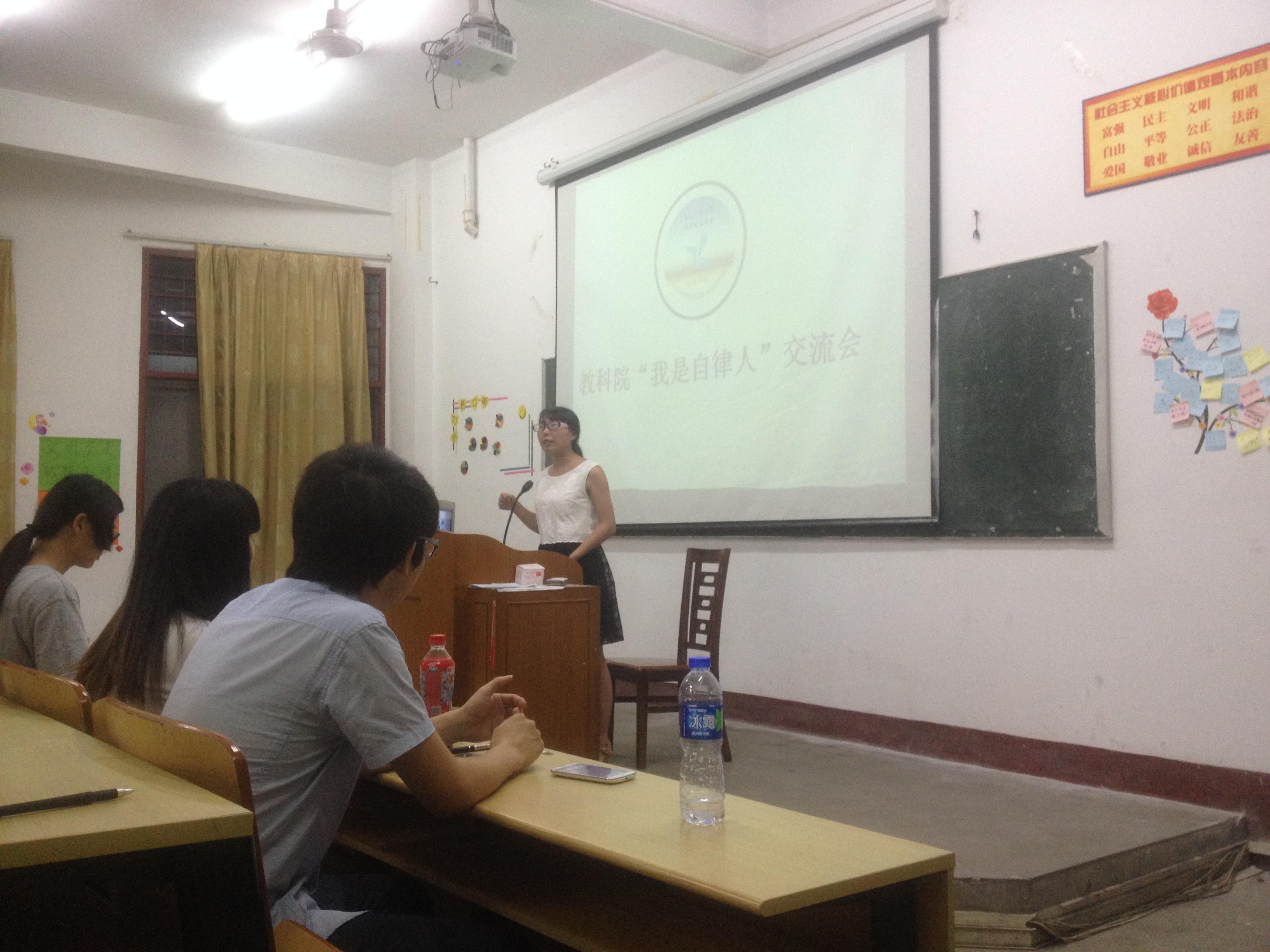 为了进一步提高宿舍文明建设,加强我院自律会的工作水平,5月15日晚,由教育科学院学院主办的”我是自律人”工作交流会在梯教一举办。出席本次活动的有13级辅导员(自律会指导老师)崔文菊老师、院自律会学生干部以及各年级和班级的同学代表。