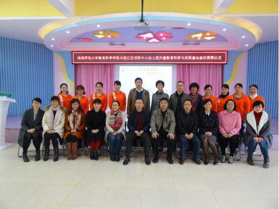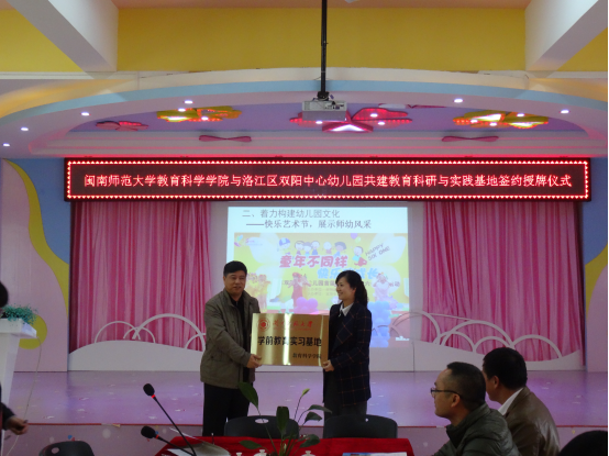 2016年1月11日上午,太阳成集团tyc33455ccww教育教育科学学院黄清院长带领学前教育系专业教师及项目合作幼儿园园长一行8人到泉州洛江区双阳中心幼儿园举行了教育科研实践基地签约授牌仪式。洛江区教育局党组书记、曾志宏局长及幼教股、人事股负责人员、双阳中幼儿园园长和骨干教师代表参与了授牌仪式。泉州洛江区是我校师范生培养创新实验区之一,前几年都是与该区中小学合作,今年把创新实验区的工作拓展到幼儿园。双阳中心幼儿园是我校在洛江区建立的首个教育科研实践基地。该园创办于1960年,2006年3月被评为泉州市优质幼儿园,2010年12月被评为泉州市示范性幼儿园。双方共同商议了实践基地建设的思路与措施,并就师范生的实践能力培养和幼儿园教师的科研与培训工作的合作进行了初步的规划,双方表达了长期合作的愿望,以期实现高校和幼儿园的资源共享、互利共赢、共同发展。目前我校学前教育专业在漳州、厦门、泉州等地都已建立实践基地,为提高师范的实践能力提供了重要保障。
