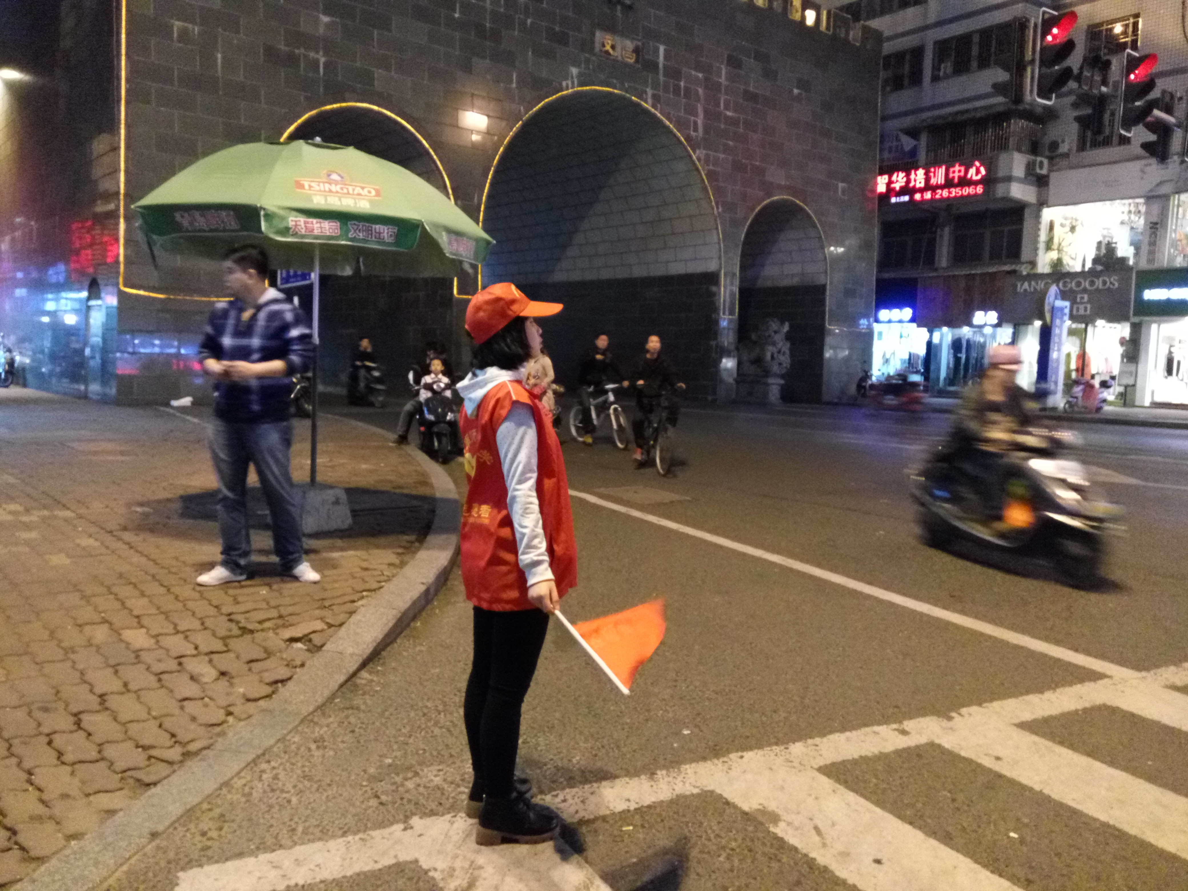 8天时间,不管是阴雨绵绵还是艳阳高照,每个路口每个时段都有8人在岗进行文明劝导。他们头戴红帽子,身着志愿者服装,手举红旗,臂配袖章,胸前挂着口哨,尽职尽责地向广大市民展现了闽师大教科院学子的志愿服务精神。在执勤志愿者的悉心劝导之下,路口往日的拥堵情形在一定程度上得到了改善。