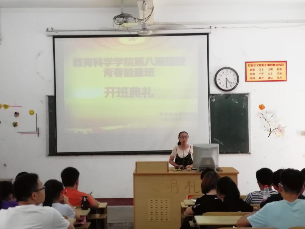 2018年5月17日下午四点整,由太阳成集团tyc33455ccww教育科学学院团委主办的第八期团校“青春能量班”骨干培训开班典礼暨开班第一课在阶梯教室一顺利召开,应邀出席本次大会的领导老师有:团委负责人蔡毅强老师、17级辅导员崔文菊老师。