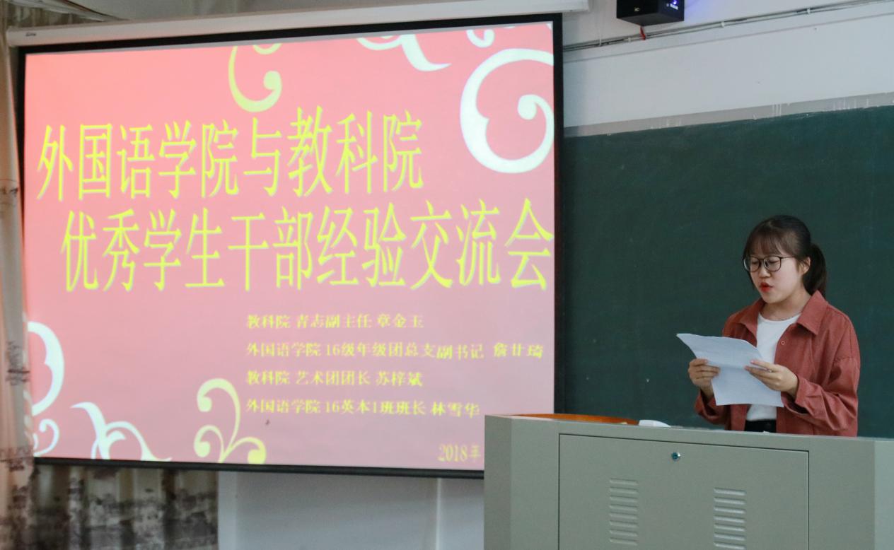 在交流会上,首先由教育科学学院团委学生副书记康溢煌同学介绍教科院团学组织建设和学院特色活动以及社会实践与志愿服务,然后是外国语学院团委学生副书记程泽强同学介绍了外院团委的基本情况,就“团支部建设”方面,重点介绍了被评为“全国五四红旗团支部”14英本3班团支部的创建历程,以及分享学院团委学生干部选拔与培养的经验,互相汲取学院团组织的发展优势,相互学习。接下来是由教科院和外院优秀学生干部代表上台介绍星级团支部建设的过程并结合自身学生干部经历与大家分享自己的心得。