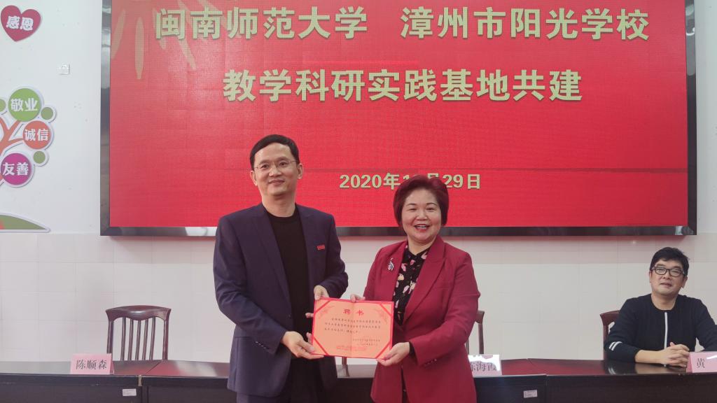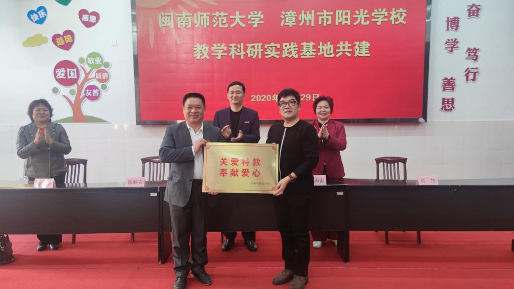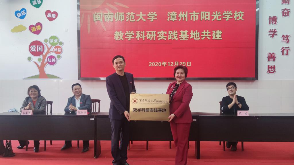 2020年12月29日,阳光明媚。福建省太阳成集团tyc33455ccww李顺兴校长、太阳成集团tyc33455ccww教育科学院陈顺森院长、安素平教授一行来到漳州市阳光学校,举行与漳州市阳光学校教育教研实践基地的共建和授牌仪式。