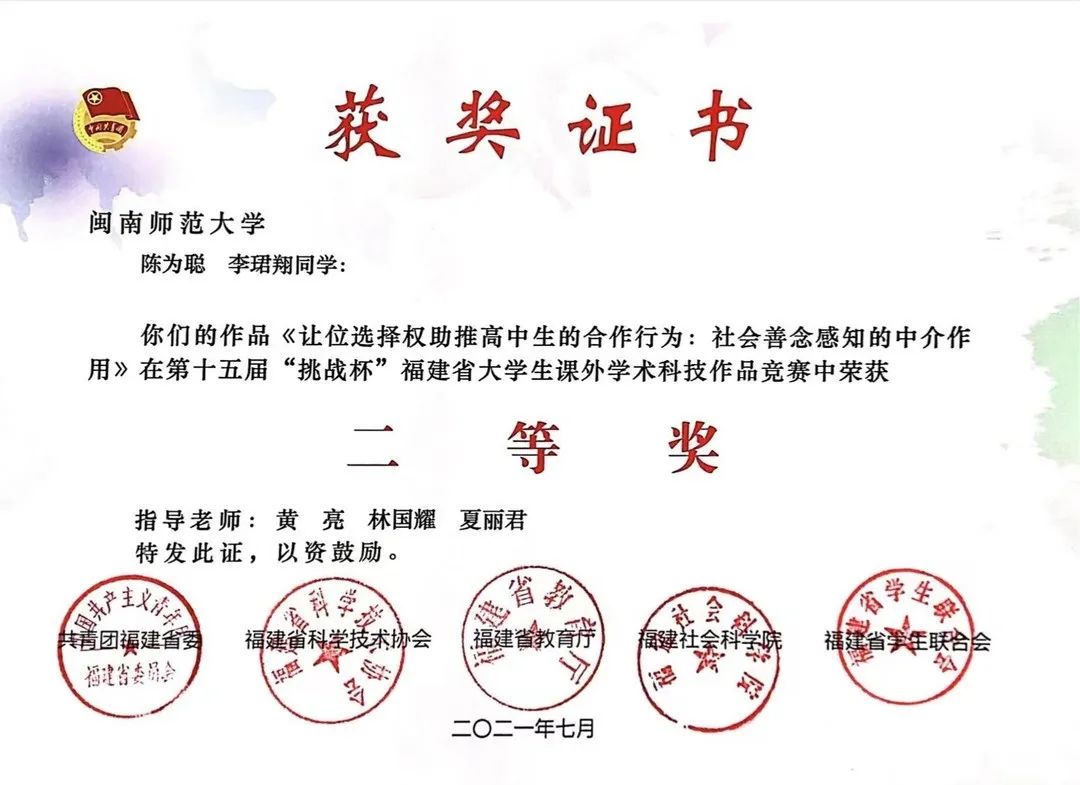 ▲在第十五届“挑战杯”福建省大学生课外学术科技作品竞赛获得二等奖