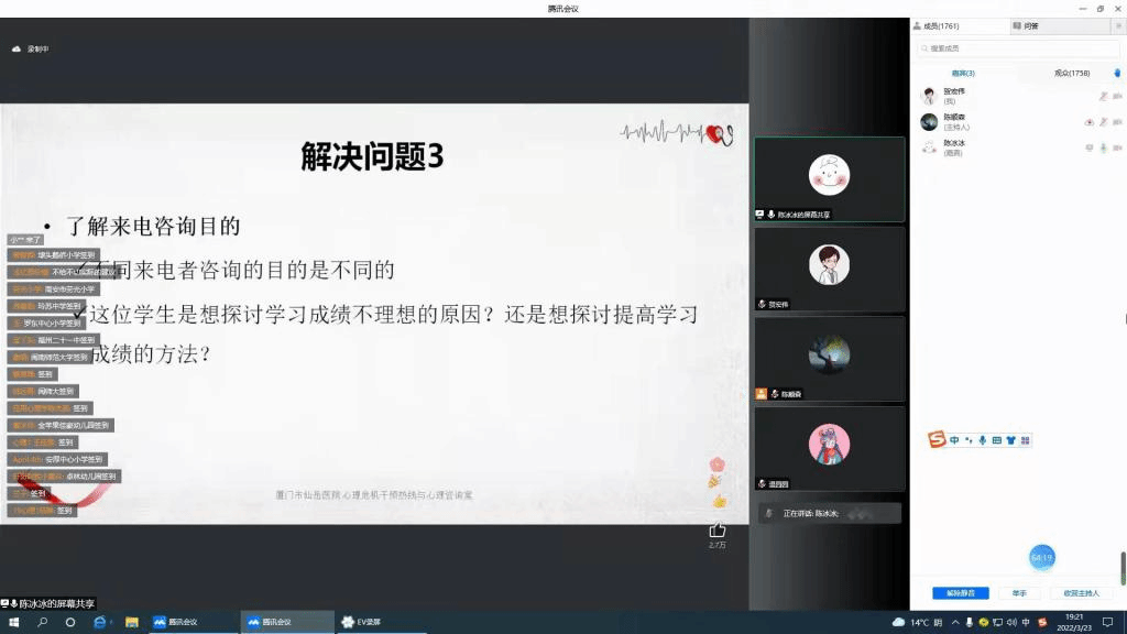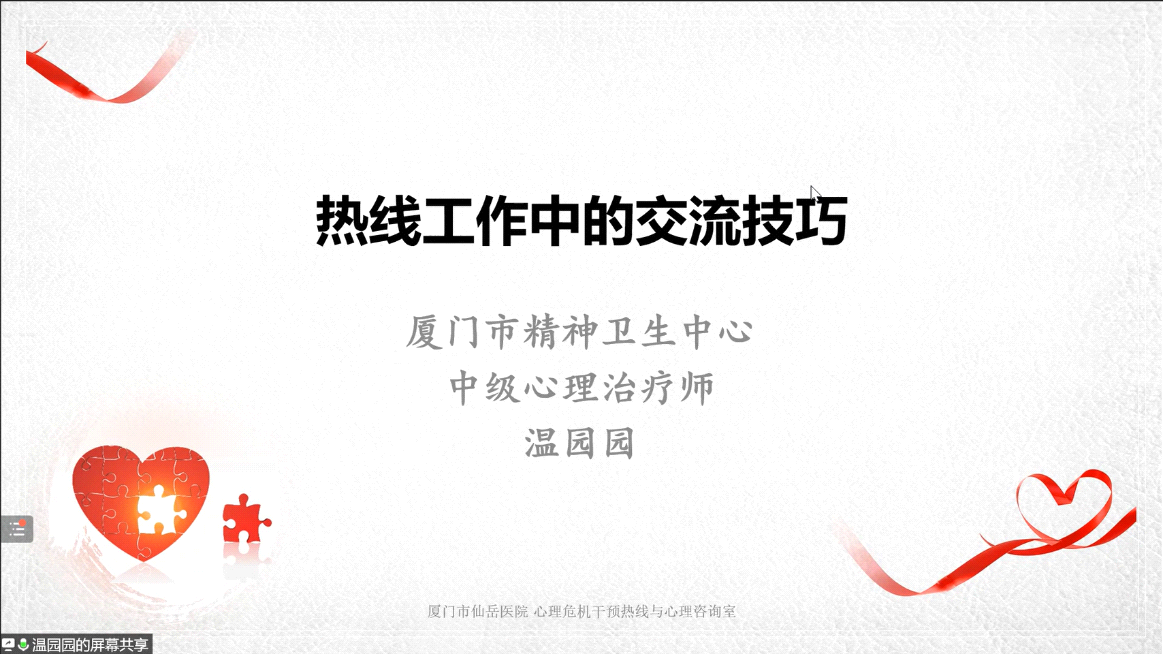 为了帮助疫情防控期间各级各地未成年人心理健康辅导站科学规范地通过热线电话帮助未成年人及其家长,经过紧张周密部署,“热线危机干预系列培训”于2022年3月23日晚上以线上直播方式高效率登场,厦门市精神卫生中心、厦门仙岳医院心理危机干预热线与心理咨询室陈冰冰、温圆圆两位富有经验的治疗师分别讲解了热线接电基本程序、热线电话接线技巧等基本功。两位授课老师结合多年的实际工作经验、生动的案例,帮助学员清晰地梳理了热线接电基本程序,包括热线接听前相关准备、接线员的精神面貌、接听基本流程阶段,以及记录和自我照料等;结合丰富的案例,强化了学员们对接线技巧、注意事项的认识,掌握了倾听、核实感受、核实感知、语速音调等信息的敏感捕捉等热线接听的实用技巧。