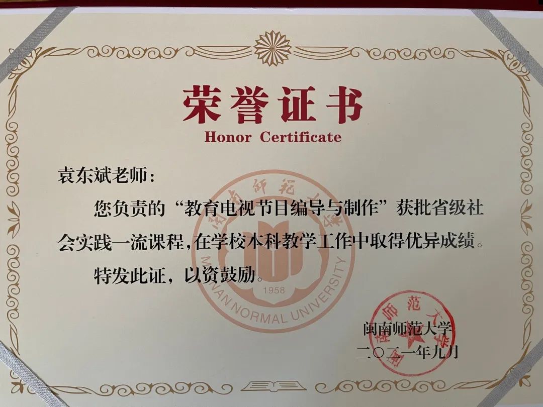 近年来,他在教学比赛中屡获佳绩,获得省级移动教学大赛二等奖一次;校教学创新大赛一等奖一次;校本科教学一等奖两次、二等奖一次;在教学过程中,他善于反思创新,能充分发挥专业特长,积极利用各种信息技术手段,进行教学改革,近年来,获省教学成果奖特等奖一项(排名第五,2021);校教学成果奖特等奖一项(排名第五,2020);一等奖一项(排名第五,2018);二等奖一项(主持,2022),主持省社会实践一流课程一门;参与省线上线下混合式一流本科课程一门;主持校一流课程一门,校教改课题两项。2021年袁老师教授的课程《教育电视节目编导与制作》被推荐参与国家一流课程评选。