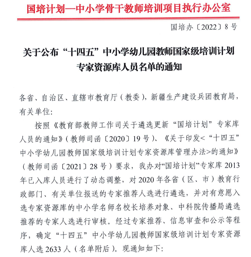据悉,本次遴选工作历时两年,经过专家推荐、信息审查和公示等程序,最终确定2633人。符合入选条件的专家,要求教书育人成绩突出,学术造诣较高,具有丰富的理论和培训实践经验,在本领域和同行中享有较高声誉。入选专家将承担“国培计划”相关项目培训教学、课程开发、资源建设等任务;参与“国培计划”项目规划设计、政策与标准研制、项目评审、项目调研、跟踪指导与质量评估等。