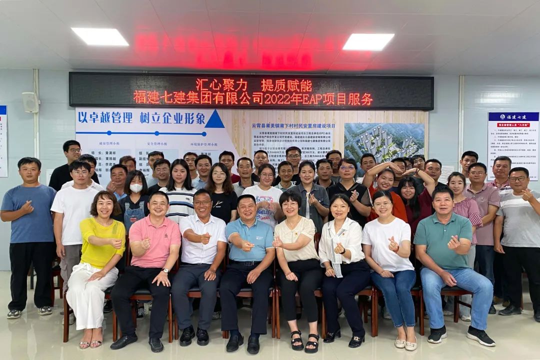 为积极落实高校社会服务职能,响应党和国家关于加强社会心理服务体系建设的号召,7月27日,我院院长陈顺森教授、心理学系主任赵广平教授、我校优秀校友、国家二级心理咨询师、龙岩市第三医院心理科副主任刘茂峰三位专家受邀前往福建省七建公司云霄县莆美镇莆下村村民安置房项目部,为项目部职工送上一场EAP盛宴,在施工现场的“铁石丛林”中打造一块温馨的心灵驿站。