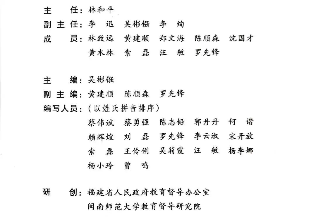 在礼赞福建“两项督导”丰收硕果时,我们特别感谢福建省教育厅、福建省人民政府教育督导办公室林和平、李迅、李绚、黄建顺等领导同志高屋建瓴且切实具体的指导,感谢省教育厅教育督导处沈国才、黄木林、蔡伟斌等同志在本研究实施乃至书稿形成过程中给予的强力支持。深情感谢审阅本书的各位福建省“两项督导”实践的资深亲历者,他们是陈瑞迈(国家特约教育督导员、三明市教育局原副局长)、郭红(国家特约教育督导员、宁德市人民政府教育督导室原主任)、朱瑞虹(省政府督学、龙岩市教育局原局长)、黄恒柏(省政府督学、三明市教育局原调研员)、赖辉煌(省政府特约督学、泉州市丰泽区教育局原局长)、梁璋琦(省政府特约督学、福州市仓山区教育局党组成员)、苏明该(省政府特约督学、泉州市人民政府教育督导室副主任)、曾晓东(省政府特约督学、漳州市教育评估研究中心副主任)等。他们不厌其烦地多次参与书稿的讨论、审阅,他们对教育督导的满怀深情能透过屏幕感染着创作团队,他们对教育督导体制机制改革的真知灼见提升了创作团队的认识。尤其是赖辉煌督学全程深度参与了本书的修订、统稿和审阅工作,其中的辛苦自不待言。正因为有教育督导“亲友团”“智囊团”严谨细致的指导工作,本书的创作团队就具备了教育督导纯正的血统和强大的基因,本书才敢在历经15次修改后“正妆”面世。