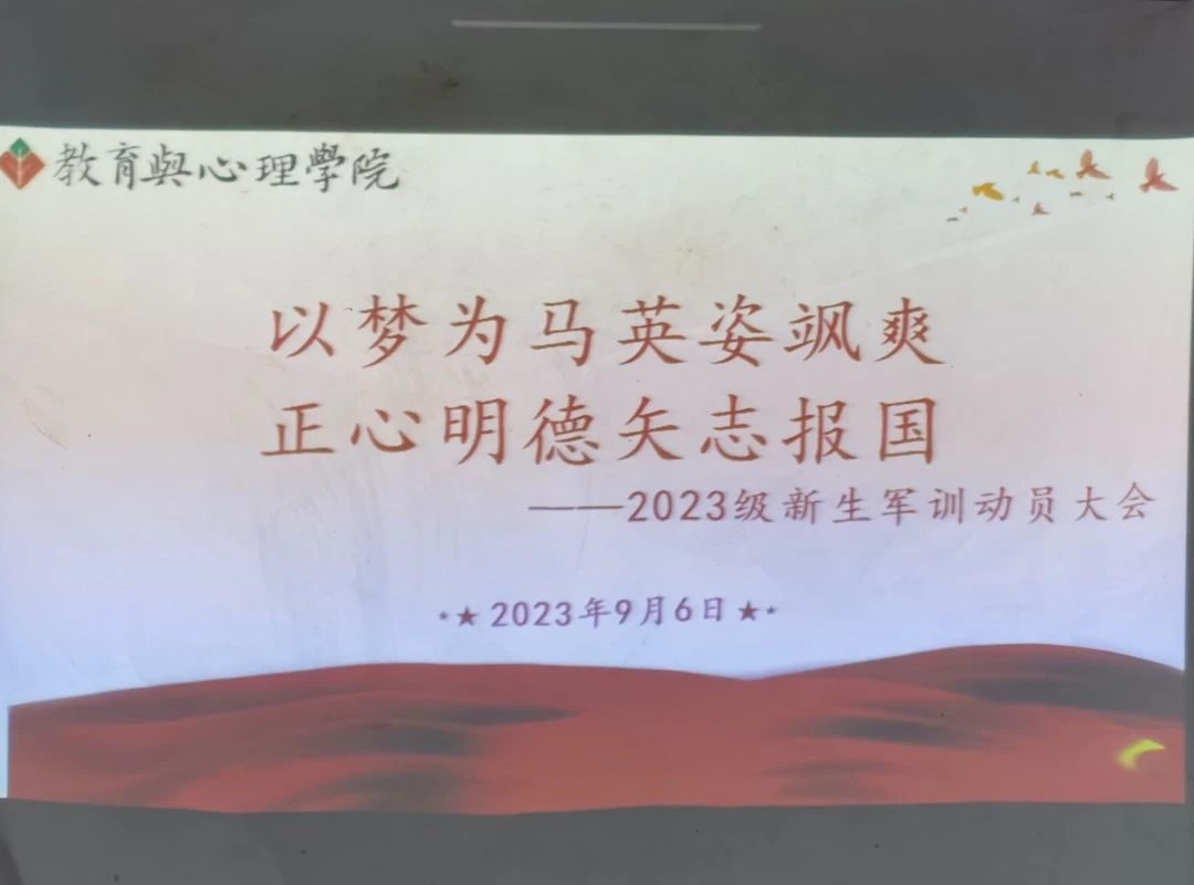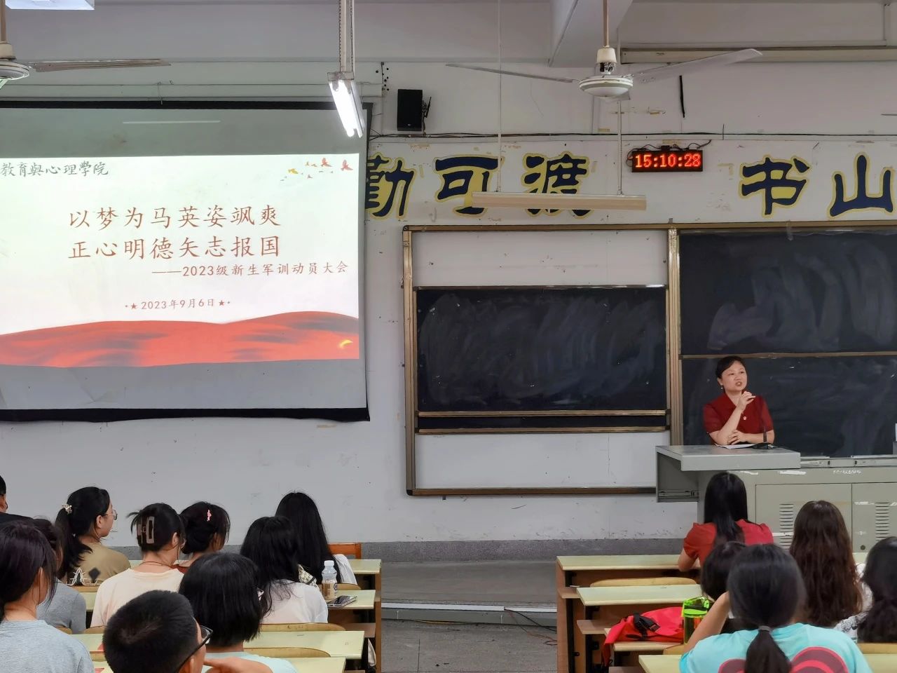 学院党委副书记杨君玉以“大学之道”为题在会上发言,为新生指明大学奋斗方向,并对学子们提出要求。杨副书记强调军训是接受国防教育的重要形式,是落实全民国防的重要体现,也是同学们进入大学的第一堂课。希望同学们通过军训培养出吃苦耐劳、顽强不屈的精神和团队精神,发扬“博学 明理 砺志 笃行”的闽师校训精神。相信在军训结束之后,2023级教心新生将成为一个斗志昂扬、勇于克服困难的统一大集体!