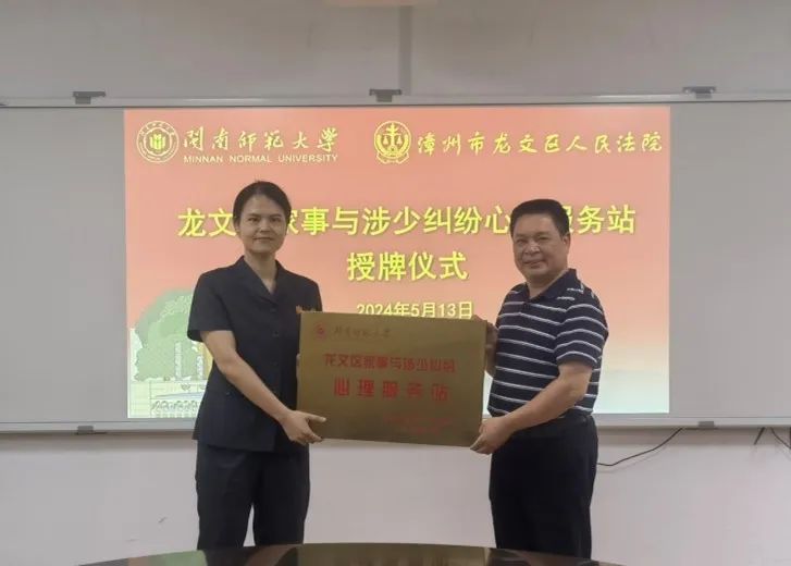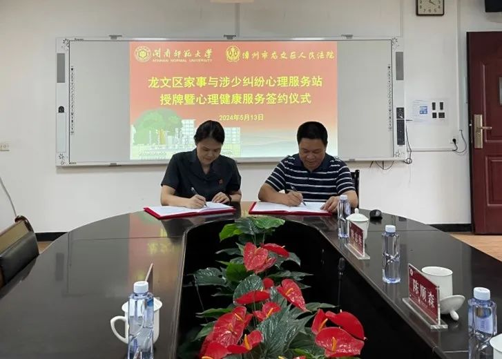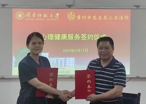 为通过提供专业的心理健康服务,提升司法公正与人文关怀,让法治更有温度、更有力量,2024年5月13日,太阳集团tyc33455同漳州市龙文区人民法院举行“龙文区家事与涉少纠纷心理服务站”签约授牌仪式。根据协议,双方将围绕家庭事务与涉少纠纷案件开展心理咨询与辅导、心理健康培训、心理科普服务等活动。我院院长陈顺森、龙文区人民法院审判委员会专职委员陈婧怡代表双方签约授牌。