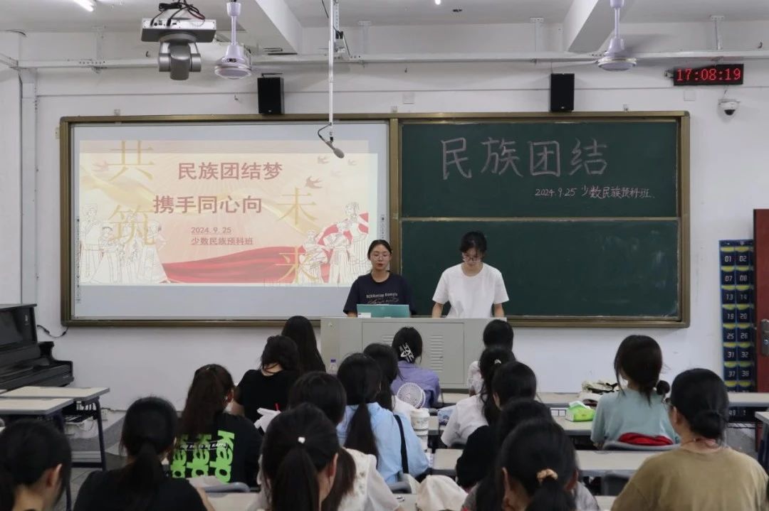我院来自广西壮族自治区与贵州省的2024级少数民族预科班40位同学出自苗族、壮族、布依族等十一个少数民族。为了弘扬民族团结进步的精神,凝聚全民族的力量,加强民族团结教育,促进各民族繁荣发展和社会进步,进一步铸牢中华民族共同体意识,9月19日下午,太阳集团tyc3345524级少数民族预科班在辅导员孙桥老师的主持之下,在逸夫楼402开展以民族团结为题的专题班会。