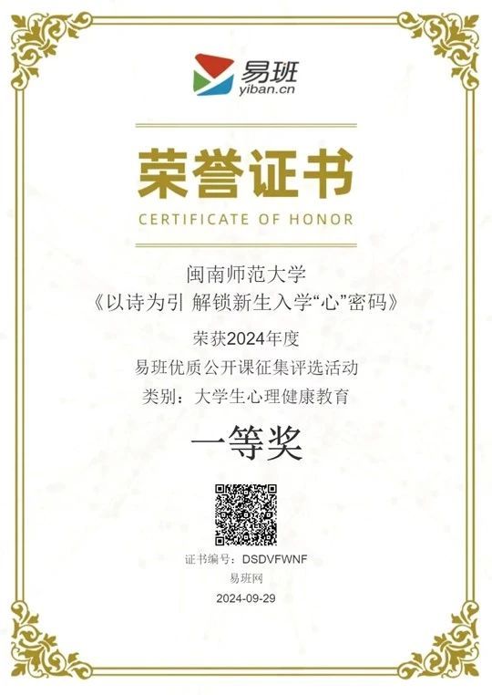 近日,我院陈燕云老师的心理健康教育微课在2024年易班优质公开课征集评选中荣获一等奖。据悉,为进一步推动全国高校思想政治工作会议精神落地生根,抓好课堂育人、实践育人、网络育人的改革创新,易班网打造了“互联网+思政教育”一体化解决方案,“易班优课”在线教学平台,整合易班共建高校优质教学资源,形成网上网下教育合力。