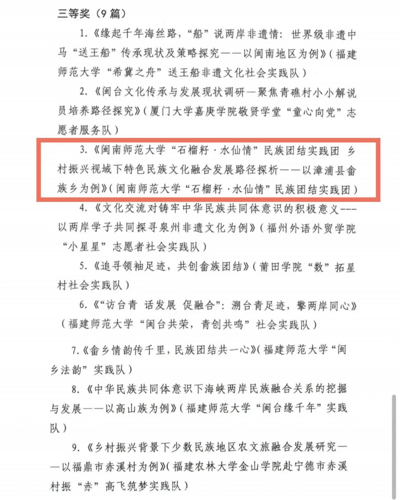 近日,共青团福建省委公布了2024年福建省大学生暑期文化科技卫生“三下乡”社会实践系列活动评选结果。在“铸牢中华民族共同体意识·百校同心八闽行”专项行动评选中,我院“石榴籽·水仙情”民族团结实践团报送的调研报告荣获三等奖、实践微视频荣获优秀奖!