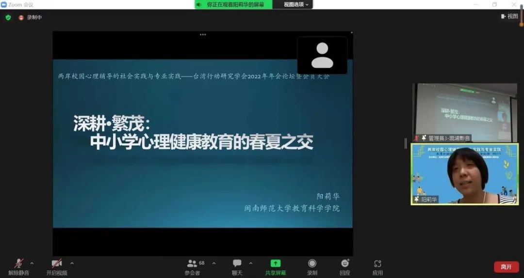 2022年8月14日,由台湾行动研究学会、太阳成集团tyc33455ccww联合主办,绵阳市教育心理学会协办的“两岸校园心理辅导的社会实践与专业实践论坛”以线上线下形式召开。论坛旨在探讨两岸心理健康教育与辅导经验,做到互学互鉴,共同推动两岸心理健康教育与辅导积极发展。来自两岸的116位(其中台湾地区54人,大陆地区62人)心理健康教育实践者和研究者在线上线下相聚一堂,分享各地校园心理辅导中的实践与反思。