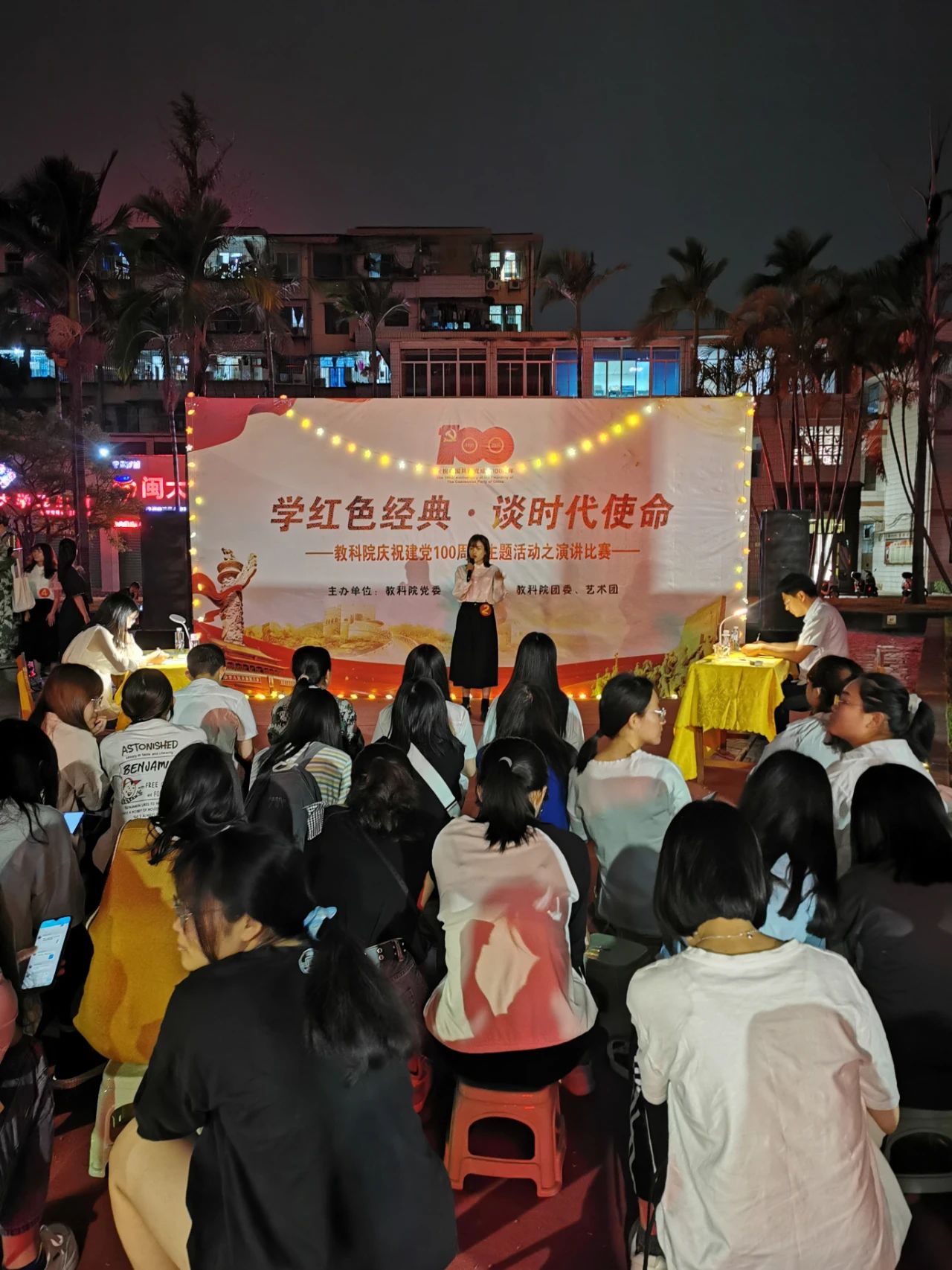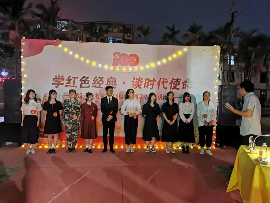 4月24日晚,由教育科学学院团委主办,院艺术团承办的“学红色经典,谈时代使命”庆祝建党100周年主题演讲比赛在10号楼前小广场成功举办。院团委书记夏丽君老师、2019级辅导员陈雅玲老师、商学院王学伍老师共同出席并担任此次比赛的评委。