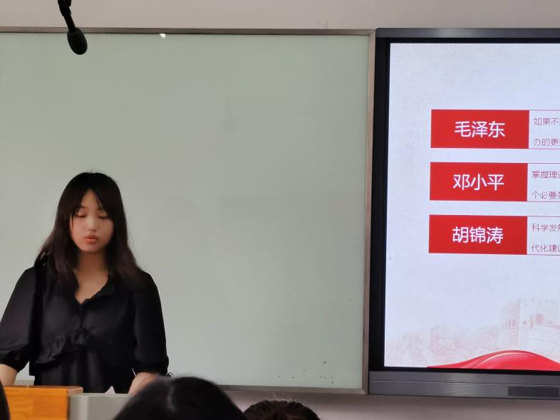 黄佳荧同学从党的历史脉络、党史三大启示、党的历史贡献、不忘初心四个部分让同学们明白学好党的历史的重大意义。了解过去才能把握今天,把握今天才能创造明天,感悟党史精神,脚踏实地,方能不负韶华。