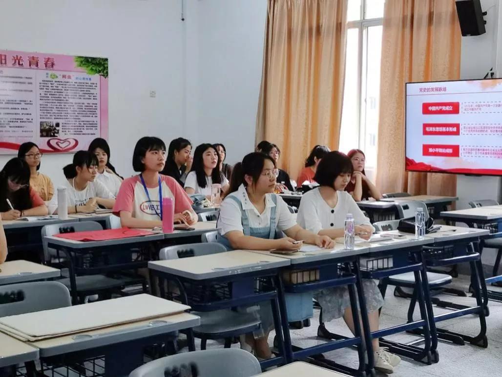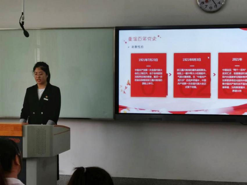 吴婉婷同学以习近平总书记在党史学习教育动员大会上的发言为导入,为我们讲解了一堂生动的“学党史,颂党恩,跟党走”主题班会课。她先向我们介绍“中国共产党”这一名称的由来,展示了百年大党波澜壮阔的奋斗历程,让大家感悟到历史是最好的教科书,百年峥嵘岁月就是一部党践行初心使命的历史,号召大家做马克思主义的坚定信仰者和忠实实践者,秉承光荣传统,怀着深厚的历史责任感和时代使命感,以青春力量,书写教育报国的奋进之笔。