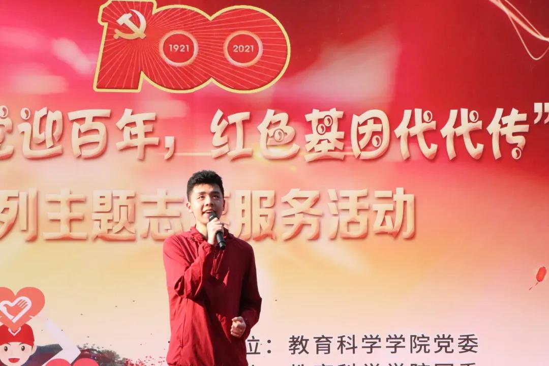 志愿者代表2019级小学教育专业李洋榕同学发言,她表示全体志愿者将以大手拉小手,通过精心设置的红色经典诵读、故事表演等课程,扮演好“红色领路人”,让爱党爱国的萌芽扎根在孩子们幼小的心田;通过与孩子们互动,以行求知,以知促行,坚定教育报国决心。