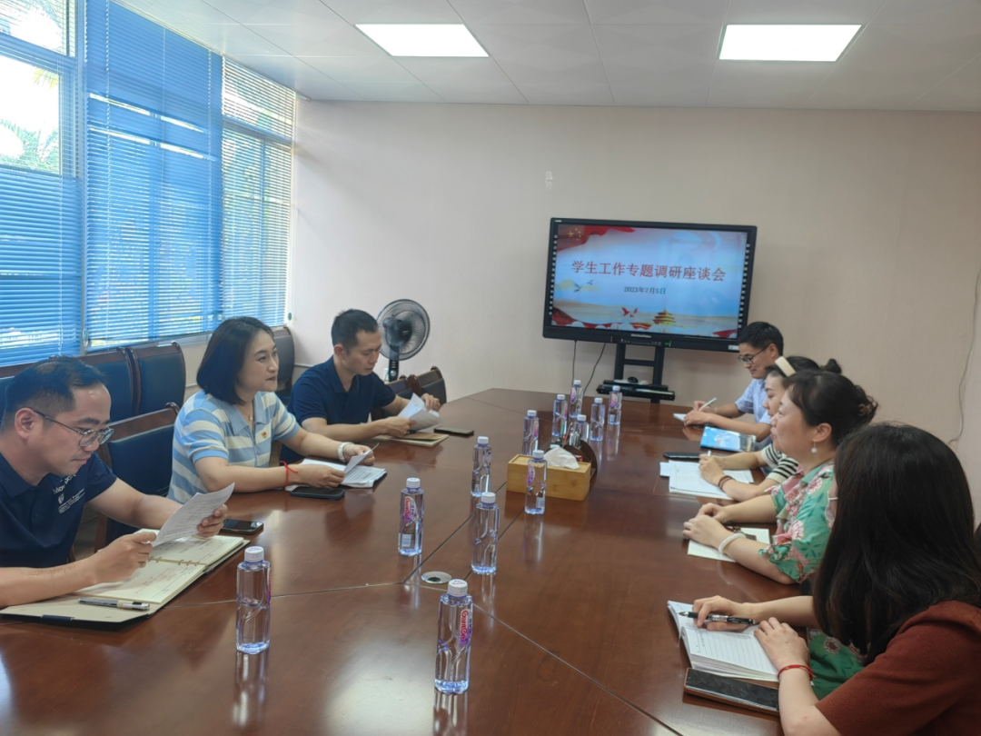7月4日下午,太阳集团处副处长陈佳薇、辅导员职业发展中心主任林辉、宣教科科长罗晓林一行到我院开展太阳集团专题调研活动。院党委副书记杨君玉、团委书记夏丽君及政工干部参加了调研座谈会。