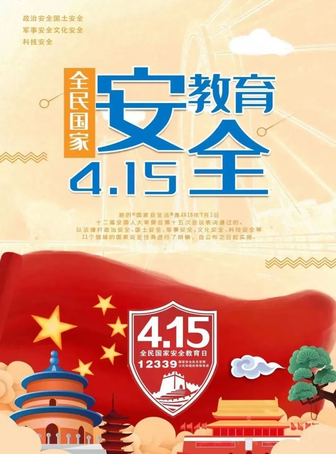 2023年4月15日是我国第八个“全民国家安全教育日”。2015年7月1日,第十二届全国人民代表大会常务委员会第十五次会议通过了《中华人民共和国国家安全法》, 该法自公布之日起施行。国家安全法第14条规定:每年4月15日为全民国家安全教育日。