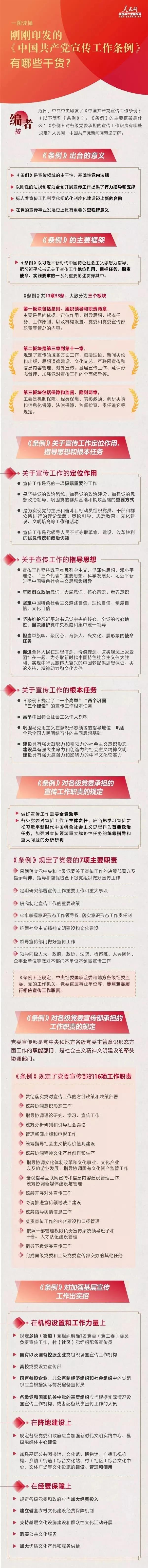近日,中共中央印发了《中国共产党宣传工作条例》,《条例》的主要框架是什么?《条例》对各级党委承担的宣传工作职责有哪些规定?人民网·中国共产党新闻网带您了解。