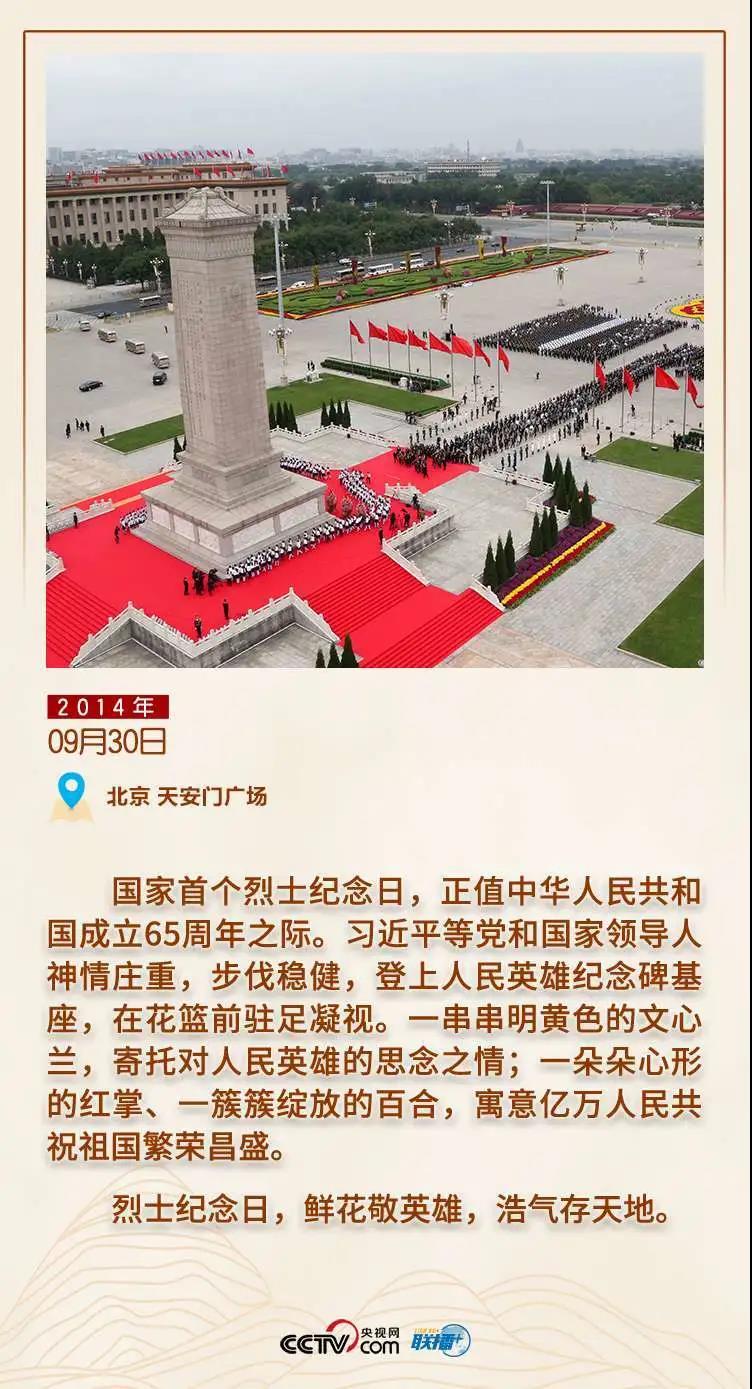 “祖国是人民最坚实的依靠,英雄是民族最闪亮的坐标。”9月30日是烈士纪念日,习近平等党和国家领导人同各界代表一起,在天安门广场向人民英雄敬献花篮。党的十八大以来,国家通过立法确定了中国人民抗日战争胜利纪念日、烈士纪念日、南京大屠杀死难者国家公祭日。天安门广场、人民大会堂、烈士陵园、抗日战争纪念馆……这些镌刻历史记忆的地方,处处留下了习近平总书记缅怀先烈、崇尚英雄的身影和足迹。“天地英雄气,千秋尚凛然”“我们一定要铭记烈士们的遗愿,永志不忘他们为之流血牺牲的伟大理想”“包括抗战英雄在内的一切民族英雄,都是中华民族的脊梁,他们的事迹和精神都是激励我们前行的强大力量”……又一个国家烈士纪念日,让我们同总书记一起感受天地英雄气,砥砺初心,奋勇前行。