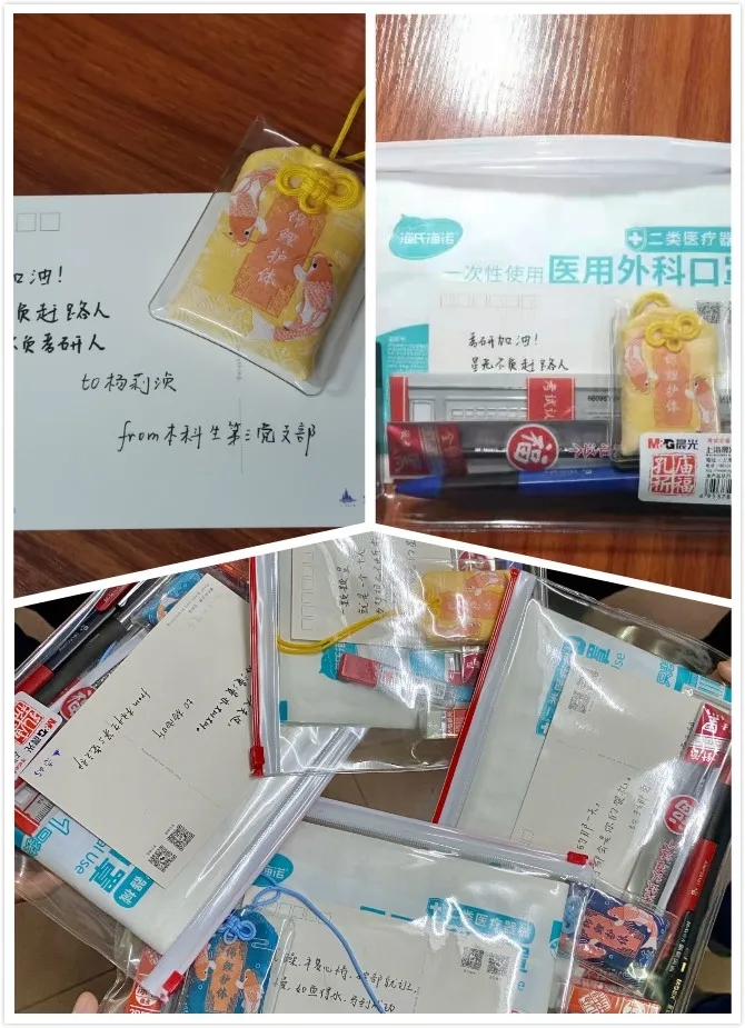 本次活动中,支部党员为各位考研同志准备了暖心小礼品,内含考场专用文具六件套、手写祝福卡片、“锦鲤护体”祈福袋、医用外科口罩等,由支部成员送至宿舍区,亲手将最真切的祝福传递至每一位考研学子的手上,预祝他们终成所愿,金榜题名。收到祝福的同志们激动地表示一定不负自己、不负期望,坚持到最后一刻。