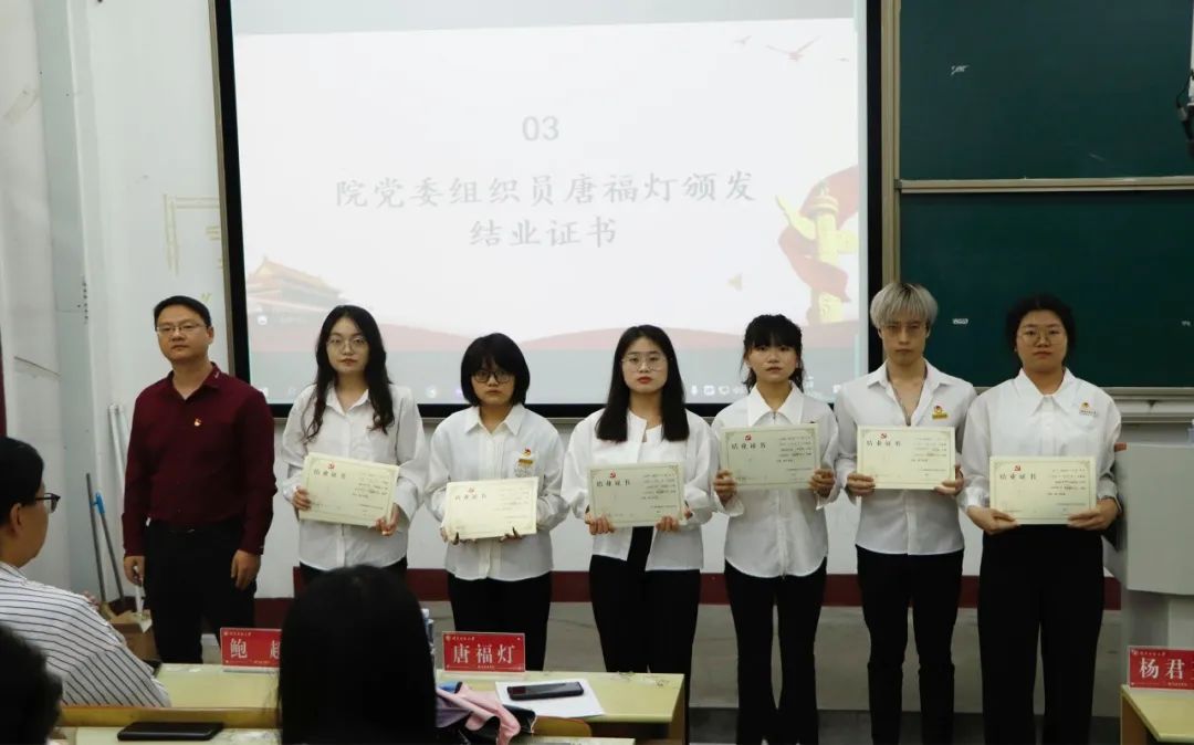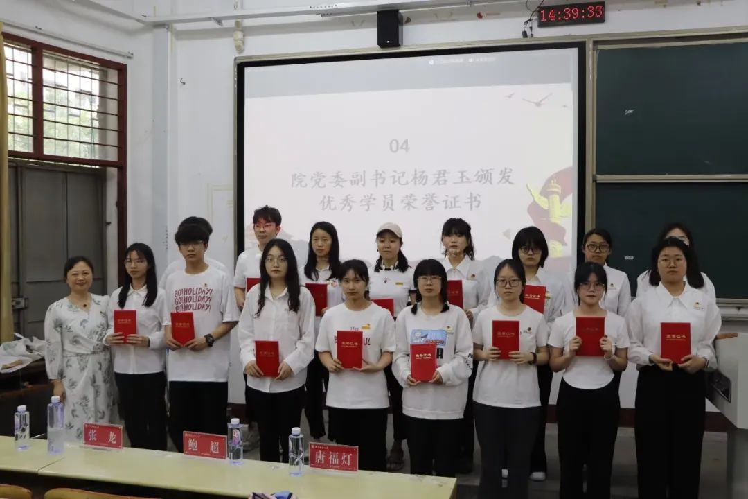 为深入践行党的二十大精神,扎实推进学习贯彻习近平新时代中国特色社会主义思想主题教育,牢牢把握“学思想、强党性、重实践、建新功”的总要求,强化入党积极分子的理论武装,院党委于4月举办分党校第二十四期入党积极分子培训班。经过为期半个月的理论学习与实践锻炼,学员们进一步融会贯通,补足精神之钙,铸牢初心使命。4月20日下午,院党委在梯教一举行本次培训班结业仪式,院党委副书记杨君玉老师、党委组织员唐福灯老师及各年级辅导员出席本次结业仪式。