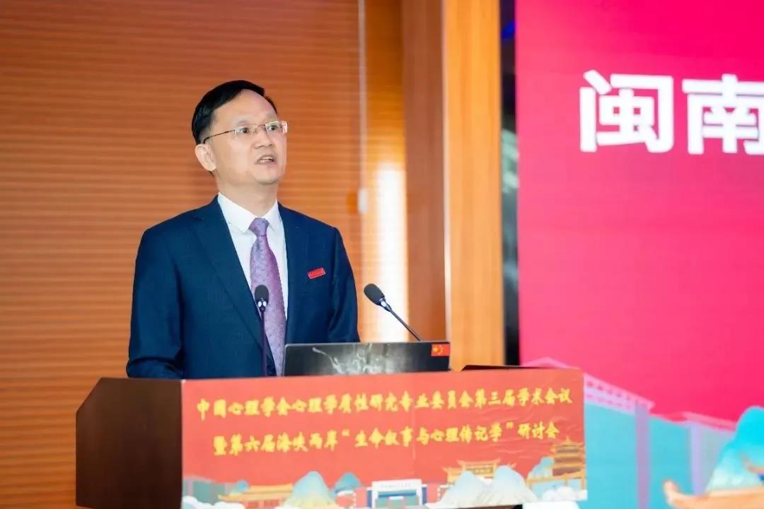 国务院心理学科评议组成员、教育部高校心理学教学指导委员会副主任白学军教授致辞,他指出本次会议以疫情下的心理学质性研究为主题,与会专家学者将使用心理学质性研究方法,呈现出对疫情下人生百态和世事民心的体认与觉察,展示两岸心理学工作者的家国情怀和责任担当;期待闽南师大心理学团队充分利用资源优势,深入开展两岸同胞心灵契合的心理学基础研究,用质性研究方法挖掘两岸闽南人的家族生命故事,构建世界闽南人的精神家园。