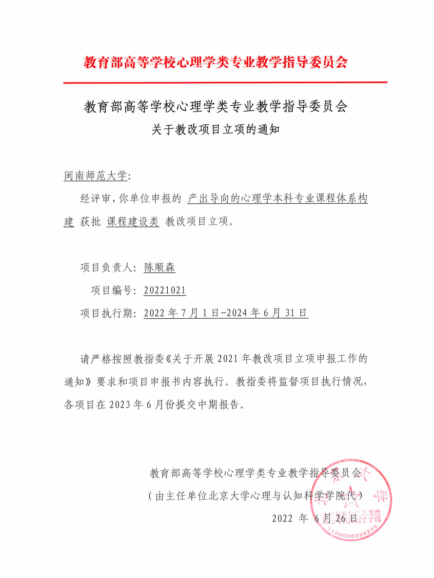 近日,教育部高等学校心理学类专业教学指导委员公布2021年教育教学改革项目立项结果,陈顺森教授负责的“产出导向的心理学本科专业课程体系构建”项目获批课程建设类教改项目立项。