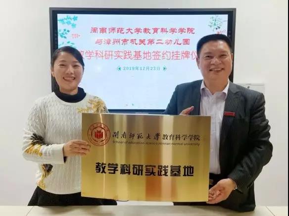 2019年12月23日,在院长陈顺森教授和副院长林培锦教授的带领下,教育科学学院与漳州市机关第二幼儿园签署教学科研实践基地共建协议。参加签约与挂牌仪式的同行人员有闽南师大附属实验幼儿园王妙珍副园长、学前教育系主任李晓霞老师、副主任刘黎微副教授以及学前教育系的其他专业老师。