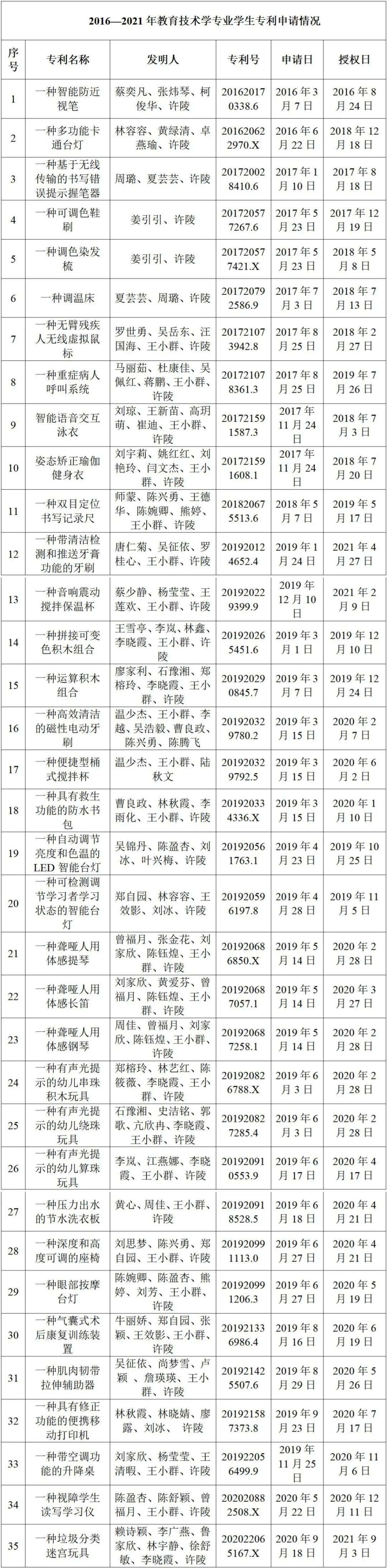 2016-2021年,教育技术学专业本科生共申请专利40多项,其中已授权专利35项。