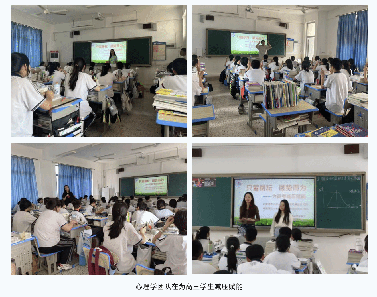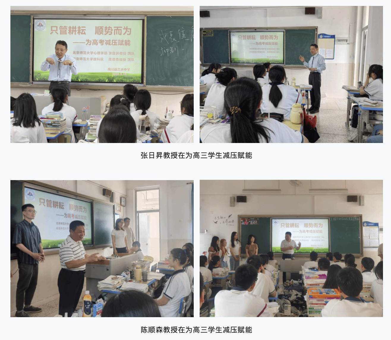 张日昇教授、陈顺森教授带领研究生专业服务团队,深入高三年级各班开展减压赋能活动,结合自身的经历,循序渐进地让学生认识学习压力、焦虑情绪,引导学生增强心理抗压性,切入感受主动学习的积极意义,缓解高考前的焦虑、恐惧、紧张等不良情绪,以“只管耕耘,顺势而为”的心态,顺利度过临考前和考试期间的人生重要时期。